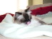 Flick is a seal mitted ragdoll. He is quite shy around strangers and will slink away at the slightest noise. Once he warms up to you he will give you lots of love in the form of head butts. He can be quite persistant if he wants on your lap, which is usually when you're sitting at the computer.